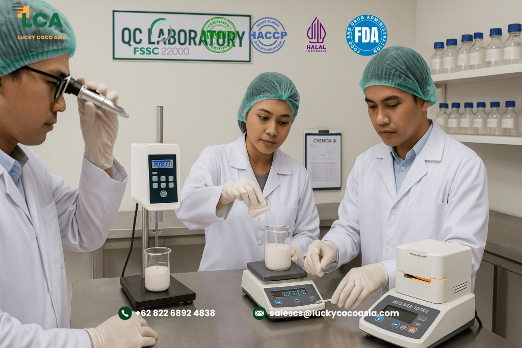 To meet this need, Lucky Coco Asia provides complete transparency. Every export batch has a unique COA and lot record. The coconuts come only from verified plantations in North Sumatra and North Sulawesi. In addition, all steps — from collection to packing — follow a controlled chain of custody. Moreover, we also have ISO 17025 standard In-house lab for daily basis quality checks.